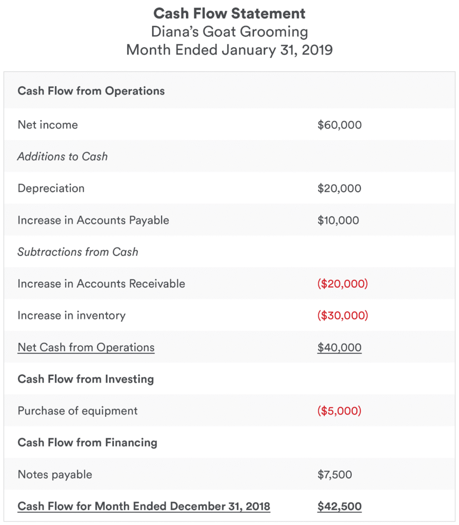 - Positive amounts (shown in black) represent increases in cash. For example, $20,000 listed under “Depreciation” is an expense on your income statement, but because no cash actually leaves your account, that amount is added back to net income.